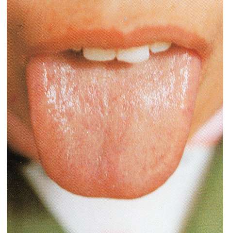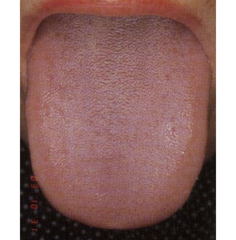 写真は、舌質がやや淡白で舌苔がやや黄色いほかは、とりたてた異常がみられないので、正常とみなすことができます。